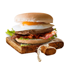 Pain fariné, steak 180gr, bacon, 2 cheddar, oeuf, crudités, sauce burger.