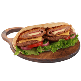 Pain maison, 3 steaks, double cheddar, crudités, sauce au choix.