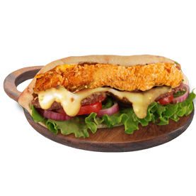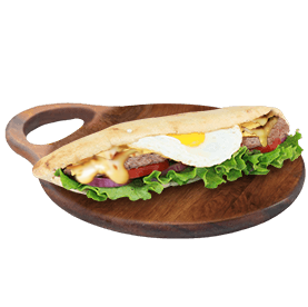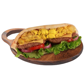 Pain maison, poulet curry, steak, double cheddar, crudités, sauce au choix.