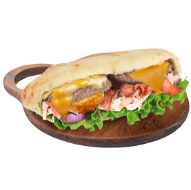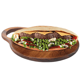 Pain maison, viande de kebab, crudités, sauce au choix.